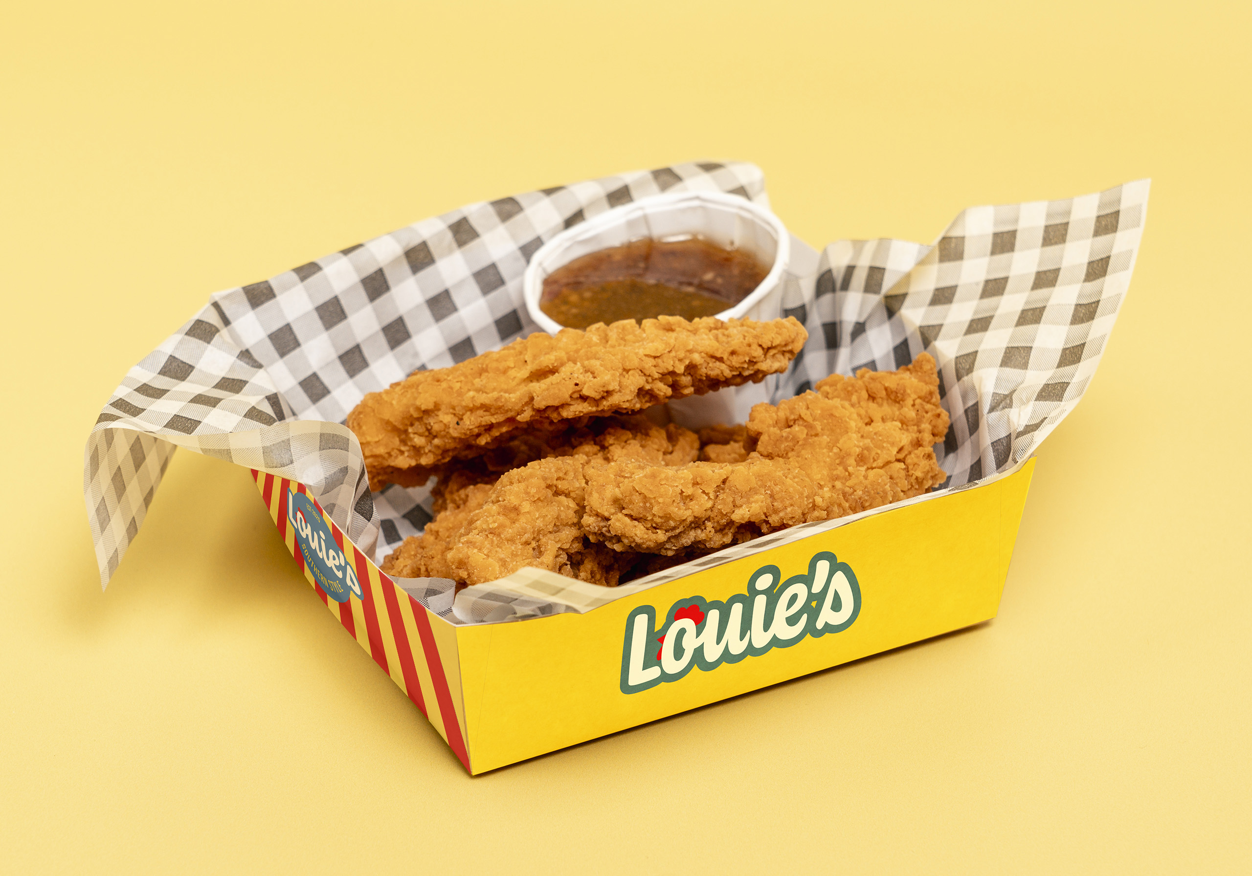 Showcase Cinemas came to us with another challenge: creating a new brand for their hot food offering. Inspired by the bold, flavour-led feel of classic American chicken shops, this led to the creation of Louie’s — a warm, familiar name with subtle Southern charm, nodding to Louisiana (with a light reference to Louis Armstrong too).